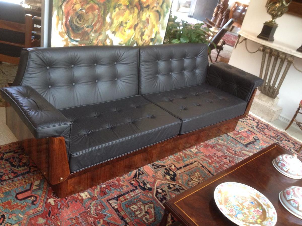 Sofá costela Novo Rumo 1970/1980... Folheado em Jacarandá e envernizado acetinado ... Tapeçaria no Tecido Corvin a pedido do cliente ...